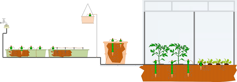 Jeder Tropfer ist Sensor und Ventil in einem. Die Tropfer sind in dem Fall mit Wasser gefüllte Tonkerzen, die mit einem Sensorkopf luftdicht verschlossen werden. Trocknet der Boden aus, wird durch den entstehenden Unterdruck die im Sensorkopf befindliche Membran nach unten gezogen und der Wasserdurchfluss freigegeben. Durch die zunehmende Bodenfeuchte um den Tonkegel baut sich der Unterdruck ab, und die Membran drückt den flexiblen Gummischlauch wieder ab. Den gewünschten Feuchtegrad stellen Sie über eine Stellschraube ein.
