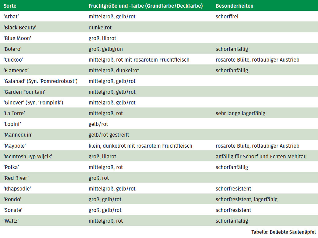Eine Übersicht über beliebte Säulenäpfel bietet diese Tabelle