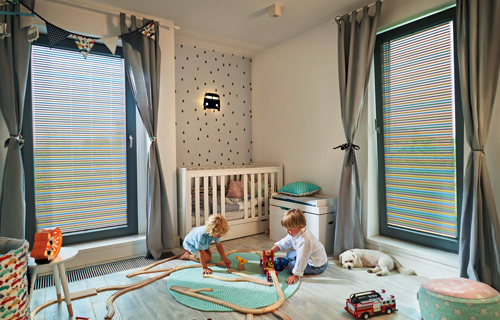 Mit farbigen Rollos lässt sich der Essbereich stimmungsvoll gestalten.