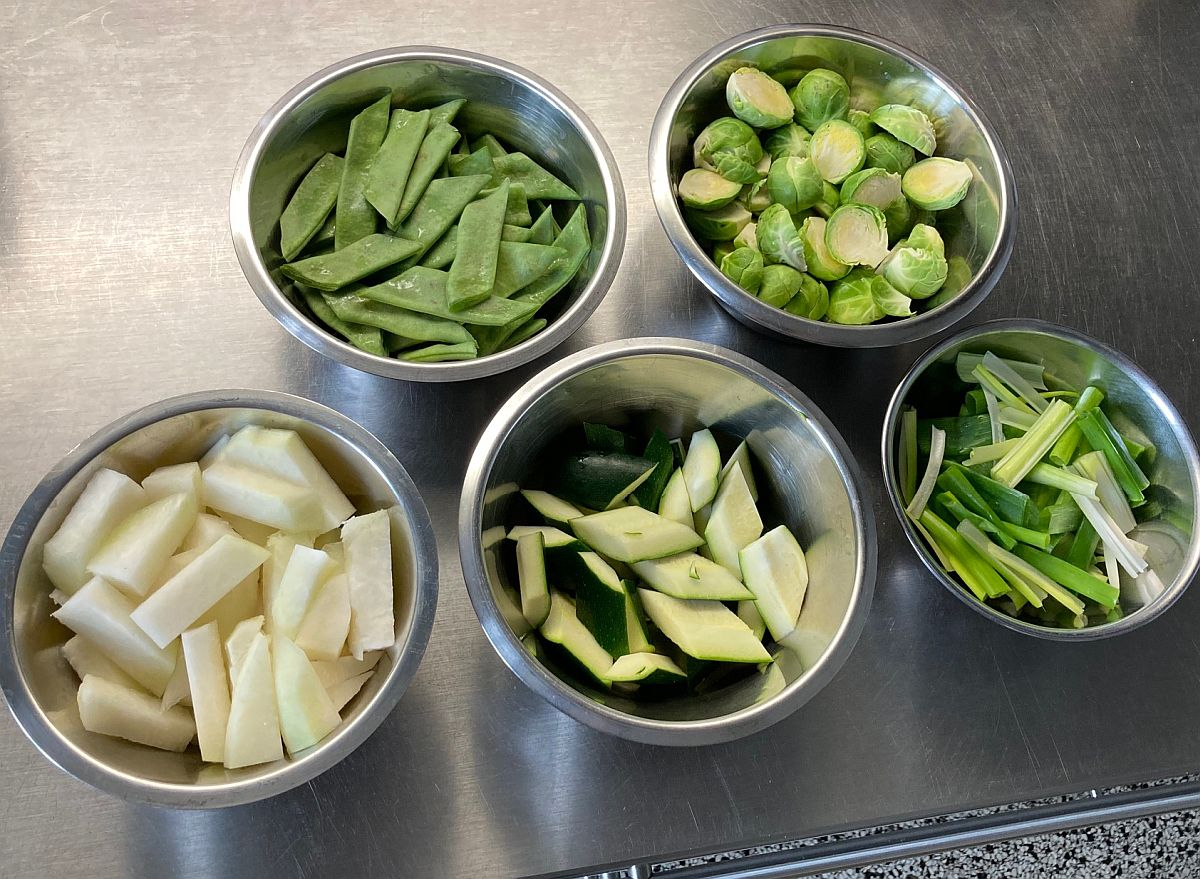 Den Rosenkohl putzen und halbieren. Zuckerschoten putzen, bei größeren Schoten Fäden ziehen und in 2 - 3 cm breite Stücke schneiden. Kohlrabi schälen und in grobe Stifte schneiden. Die Lauchzwiebel abspülen, halbieren und dann in 3 - 4 cm lange Streifen schneiden. Die Zucchini waschen, Enden abschneiden und vierteln, nach persönlichem Geschmack entkernen, oder nicht dann in ca 3 cm lange Stücke schneiden.